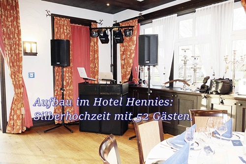 Der optisch ansprechende Aufbau mit Sound- und Lichttechnik beginnt zwei Stunden, bevor Sie und Ihre Gäste im Saal eintreffen. Backup: ein Laptop und DJ-Controller. Im Oktober 2025 wurden zwei neue Subwoofer und Laptops gekauft.