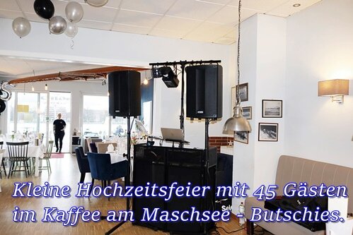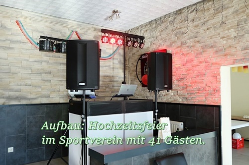 Der optisch ansprechende Aufbau mit Sound- und Lichttechnik beginnt zwei Stunden, bevor Sie und Ihre Gäste im Saal eintreffen. Backup: ein Laptop und DJ-Controller. Im Oktober 2025 wurden zwei neue Subwoofer und Laptops gekauft.